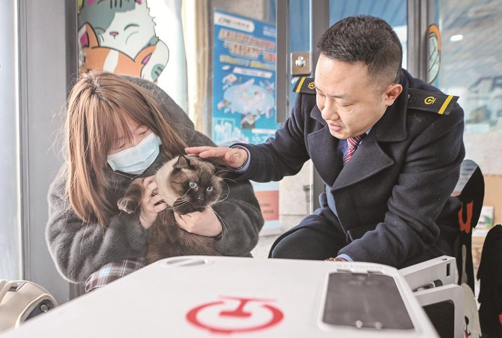 据悉,托运服务采用“人宠同车、到达同站”模式,旅客通过12306App提前预约,即可为符合条件的猫犬办理托运手续。宠物将被安置在具备通风和温度、湿度监测系统的专用运输箱内,在确保安全的同时,也避免了干扰其他旅客。 新华社记者 唐奕 摄