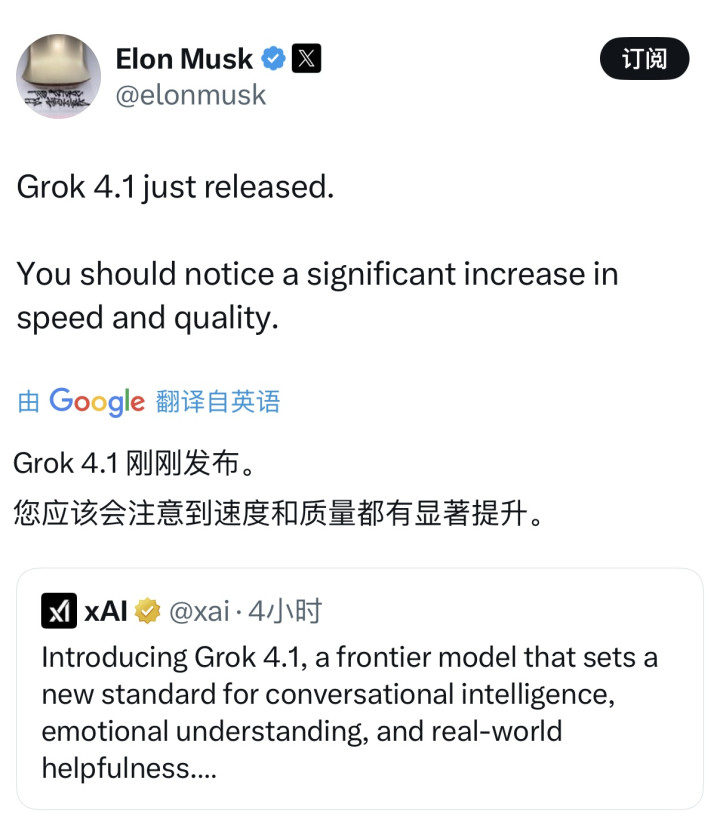 官方表示,这款前沿模型在对话智能、情感理解和现实世界的实用性方面树立了新的标准。马斯克转发并表示:“你应该会注意到速度和质量都有所提升。”